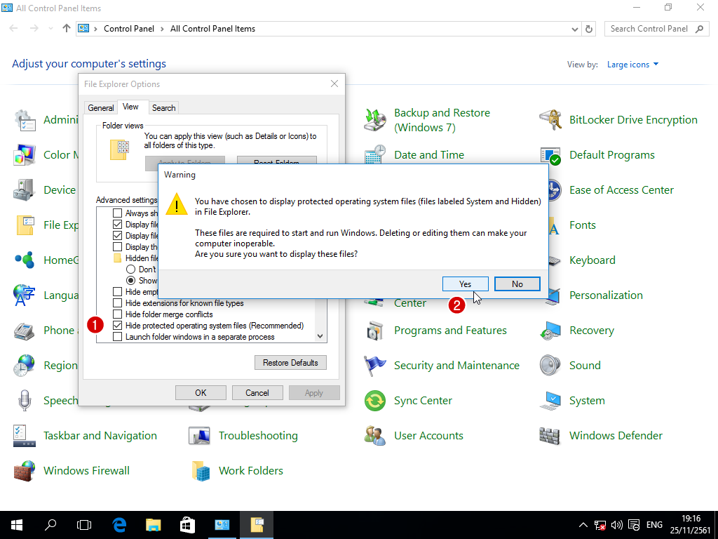 5. กรณีเราปลดเครื่องหมายออกจากหัวข้อ Hide proteced operating system file มักจะมีข้อความเด้งยืนยันความต้องการ ให้เราเลือก Yes