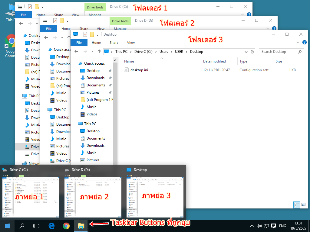3. เมื่อตั้งค่าเรียบร้อยแล้ว จะเห็น Taskbar Buttons แสดงทั้งสัญลักษณ์และชื่อ สามารถค้นหางานที่ต้องการได้ง่าย