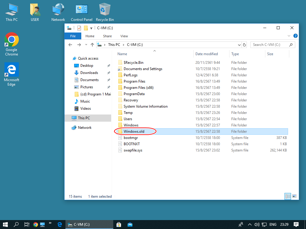 10. เมื่อเราเข้าไปดูที่ Drive C จะเห็นว่ามีโฟลเดอร์ Windows.old ซึ่งมีขนาดใหญ่มากๆ แนะนำให้ลบทิ้ง โดยอาจจะลบทิ้งตรงๆก็ได้ หรือจะลบทิ้งโดยใช้คำสั่ง Disk Cleanup ก็ได้