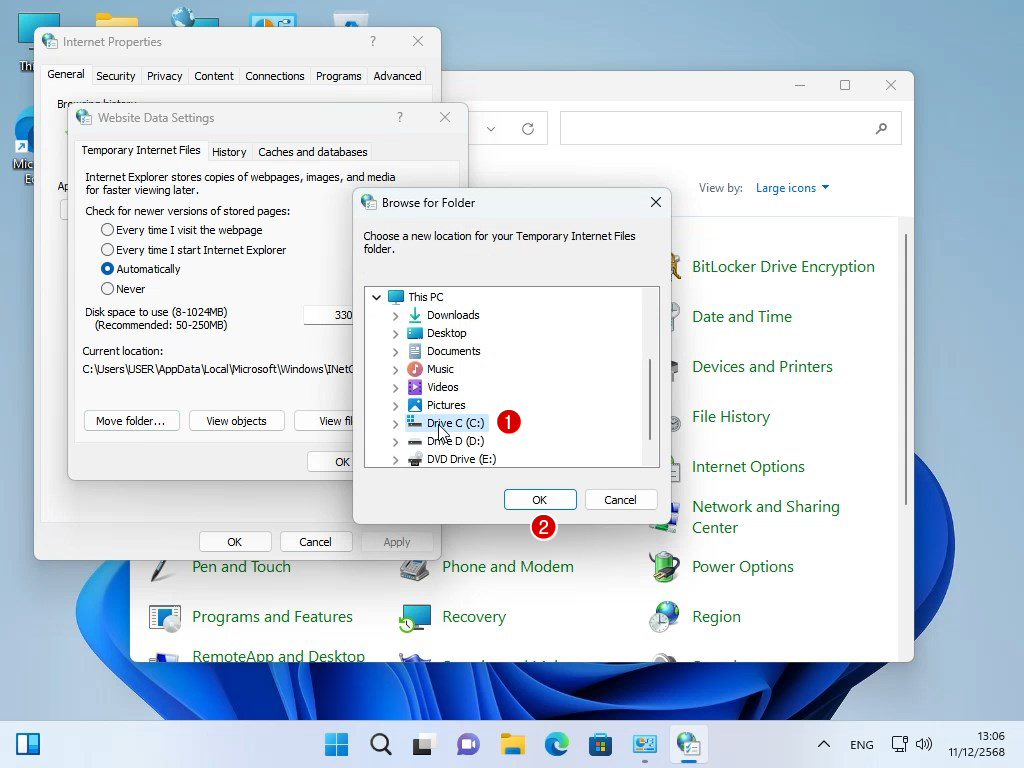 14. ในภาพตัวอย่าง จะเห็นว่ามีโฟลเดอร์ Temporary Intenet Files ปรากฎขึ้นที่ Drive C: