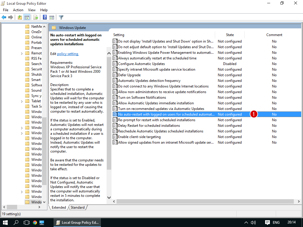 6. สำหรับหัวข้อ No auto-restart with logged on users for scheduled automatic updates installations ก็มีสถานะเป็น Not Configured เช่นเดียวกัน (ที่จริงแล้ว ทุกอันก็เป็น Not configured ทั้งนั้นแหล่ะ เพียงแต่ผมอยากให้ทุกคนสังเกตุ)
