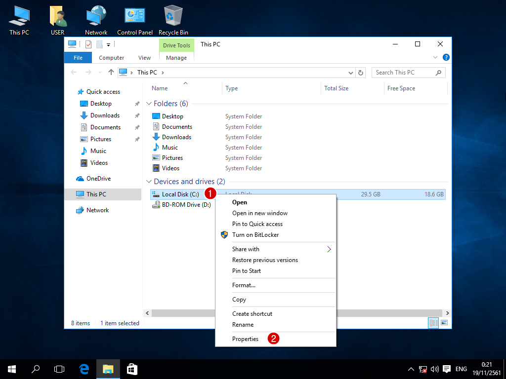2. คลิกขวาที่ Drive ที่เราจะจัดการ ในที่นี้คือ Drive C: และเลือก Properties