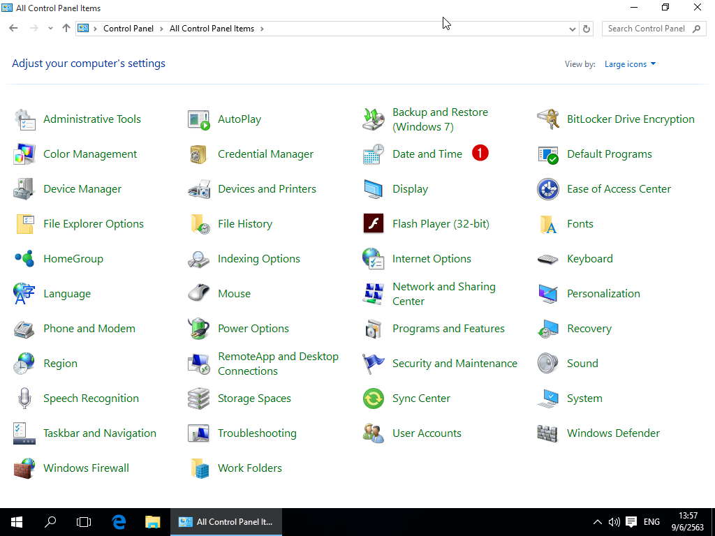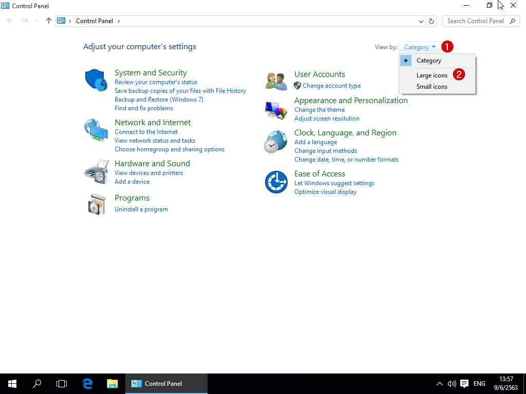 2. ถ้าหน้าตาของ Control Panel แสดงตาม Category ก็ให้เปลี่ยนไปเป็นแบบ Large icons ก่อน