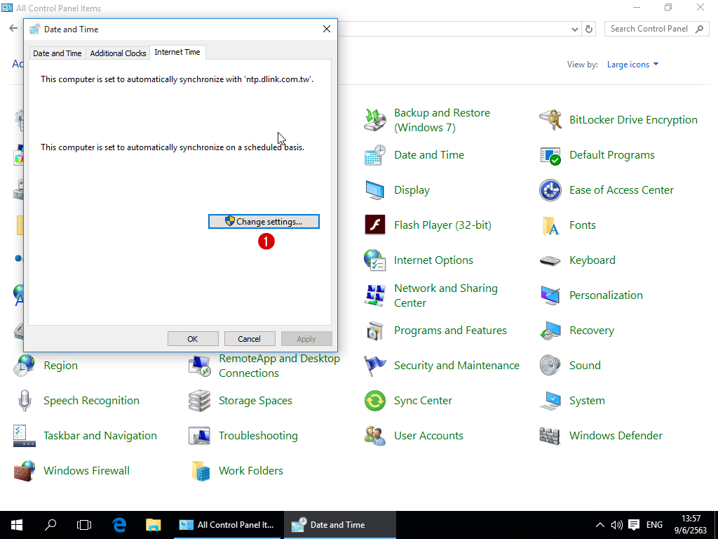 5. เมื่อเข้ามาที่แท็บ Internet Time แล้วก็ให้คลิกที่ปุ่ม Change settings