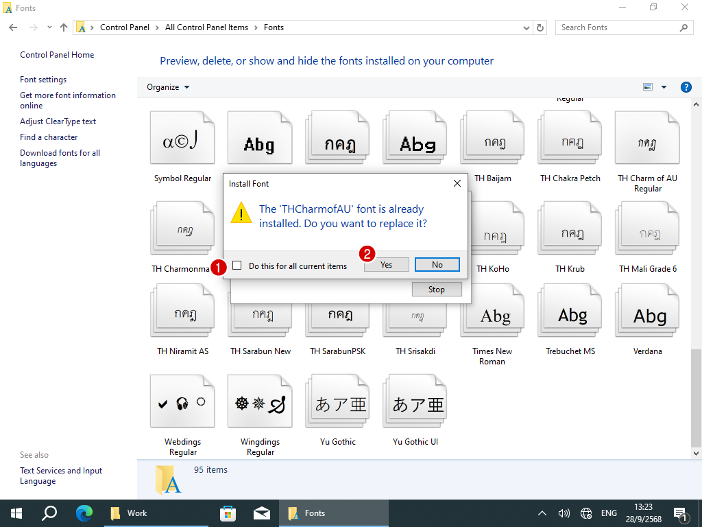 7. หากมีการตรวจพบว่าฟอนต์ที่กำลังจะติดตั้งมีชื่อซ้ำกับฟอนต์ที่เคยมีอยู่แล้ว ระบบจะถามยืนยันความต้องการจากผู้ใช้