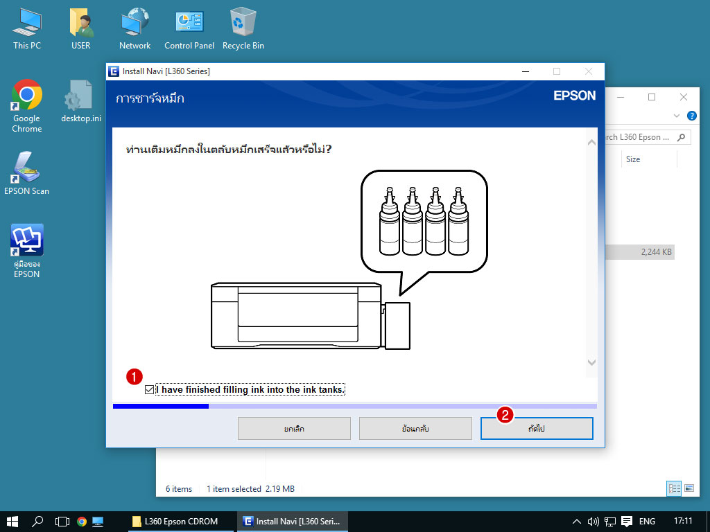 5.1 ถ้าพริ้นเตอร์ของคุณได้เติมหมึกไว้เรียบร้อยแล้ว ทำเครื่องหมายไว้ที่ "I have finished filling ink into the ink tanks"