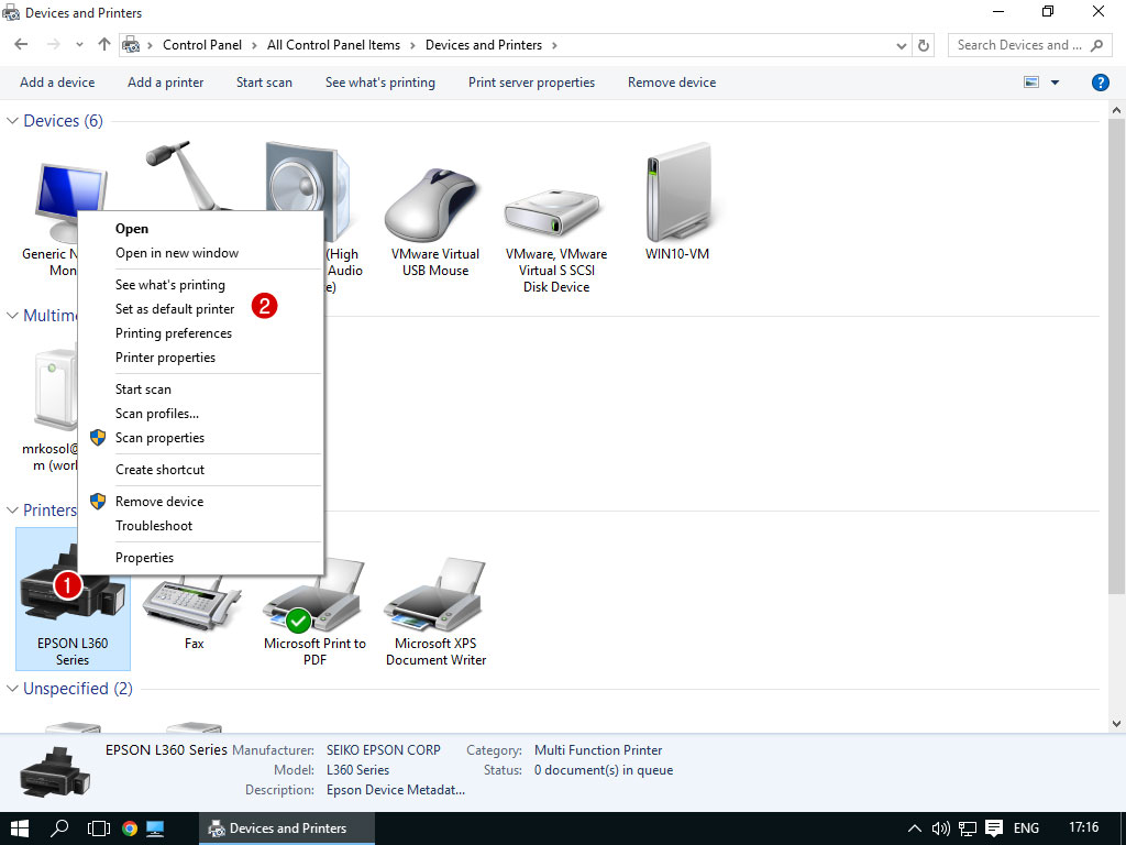 12. คลิกขวาที่รูปพริ้นเตอร์ที่เราต้องการ แล้วเลือกหัวข้อ Set as default printer