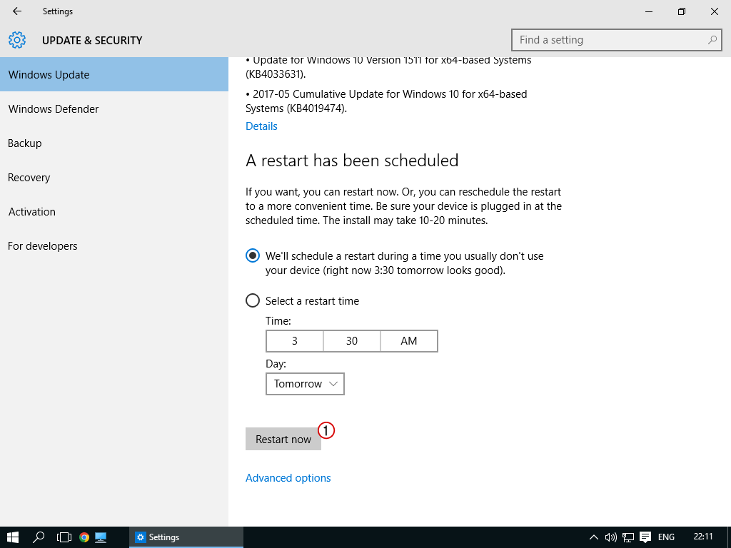 6. เมื่ออัพเดทเสร็จเรียบร้อยแล้ว ก็คลิกที่ปุ่ม Restart now หรือถ้าทำงานค้างอยู่ เราสามารถกดปิดไปก่อน แล้วค่อยสั่ง Restart หลังงานเสร็จก็ได้