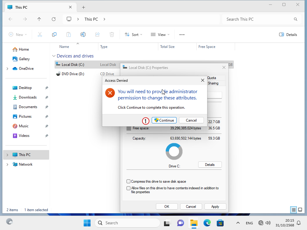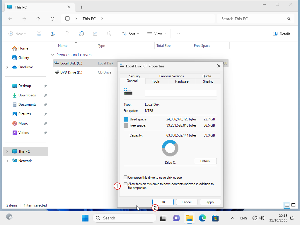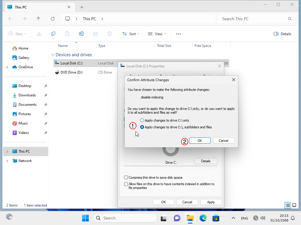 3.1 เอาเครื่องหมายออกจากหน้าหัวข้อ Allow files on this drive to have contents indexed in addition to file properties