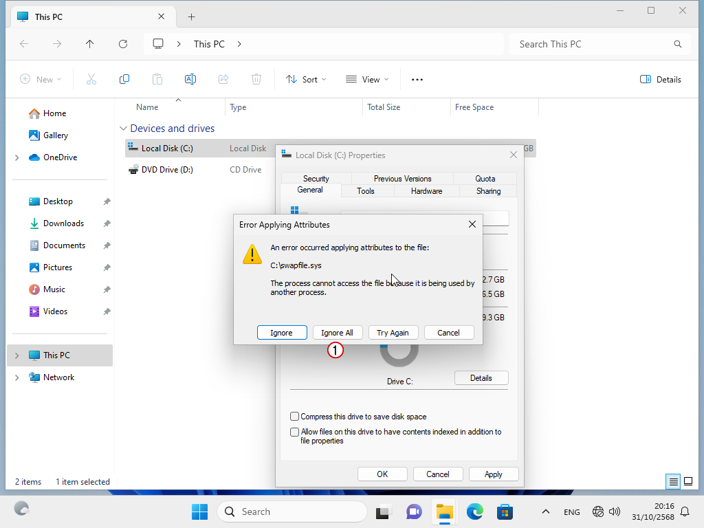 - ตามตัวอย่างนี้คือ ไม่สามารถเปลี่ยนแปลงคุณสมบัติของไฟล์ C:\swapfile.sys เนื่องจากไฟล์นี้ถูกเปิดใช้งานอยู่