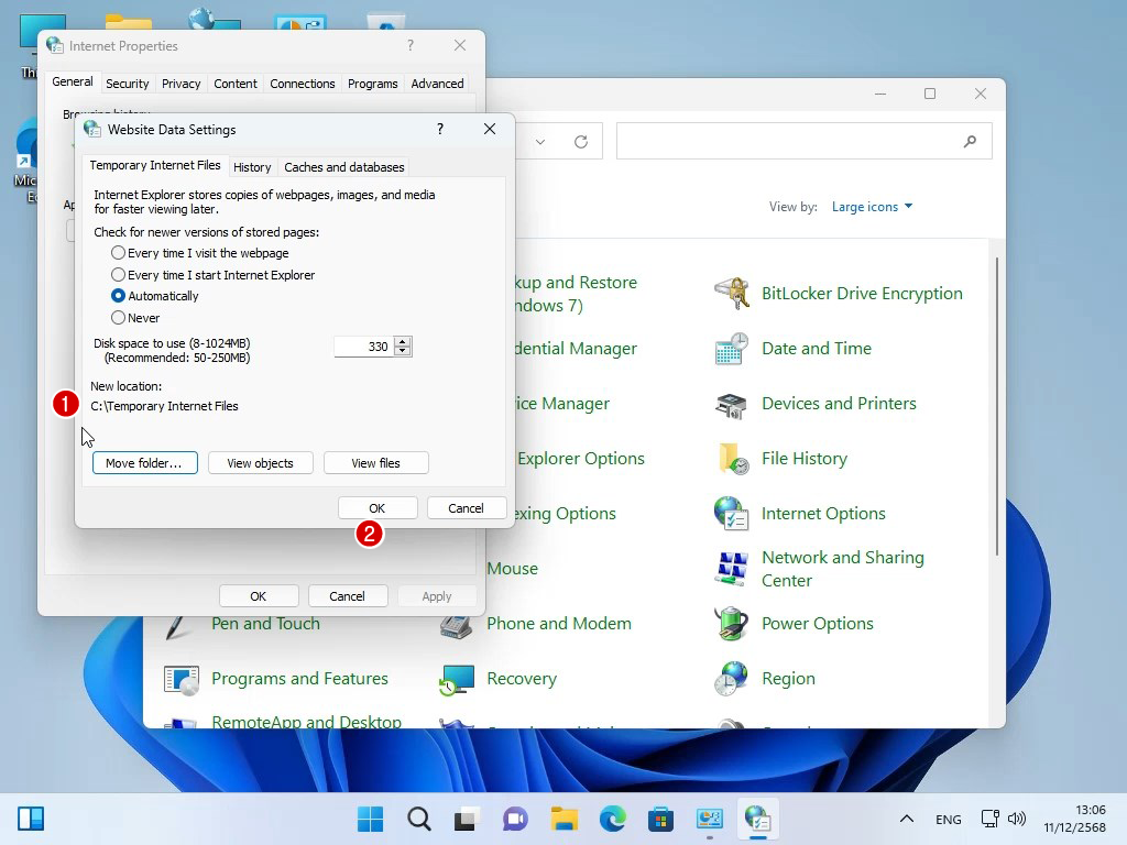 8.1 หัวข้อ Disk space to use (1) คือขนาดของขยะที่เราอนุญาตให้ Internet Explorer เก็บไว้ ในภาพตัวอย่างใส่ไว้ 330 MB แนะนำให้แก้ให้อยู่ในช่วง 50-250 MB ถ้าไม่แน่ใจ ใส่ไว้ซัก 250 MB ก็ได้