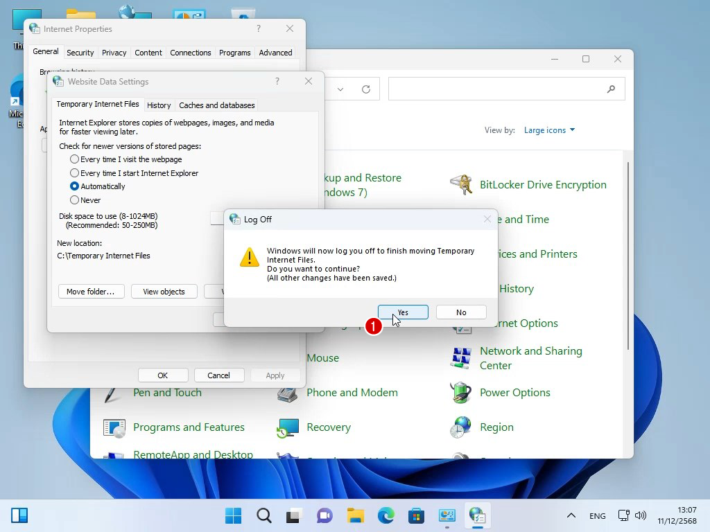 11. เนื่องจาก Internet Options ผูกกับโครงสร้างของ Windows จึงมีการเตือนให้ผู้ใช้ออกจากระบบก่อนมีการเปลี่ยนแปลง ผู้ใช้จึงควรทำการบันทึกงานที่ทำค้างไว้ทั้งหมด และปิดงานทั้งหมดที่ทำค้างไว้ก่อน แล้วค่อยคลิกปุ่ม Yes (1)