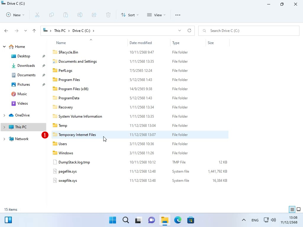 14. ในภาพตัวอย่าง จะเห็นว่ามีโฟลเดอร์ Temporary Intenet Files ปรากฎขึ้นที่ Drive C: