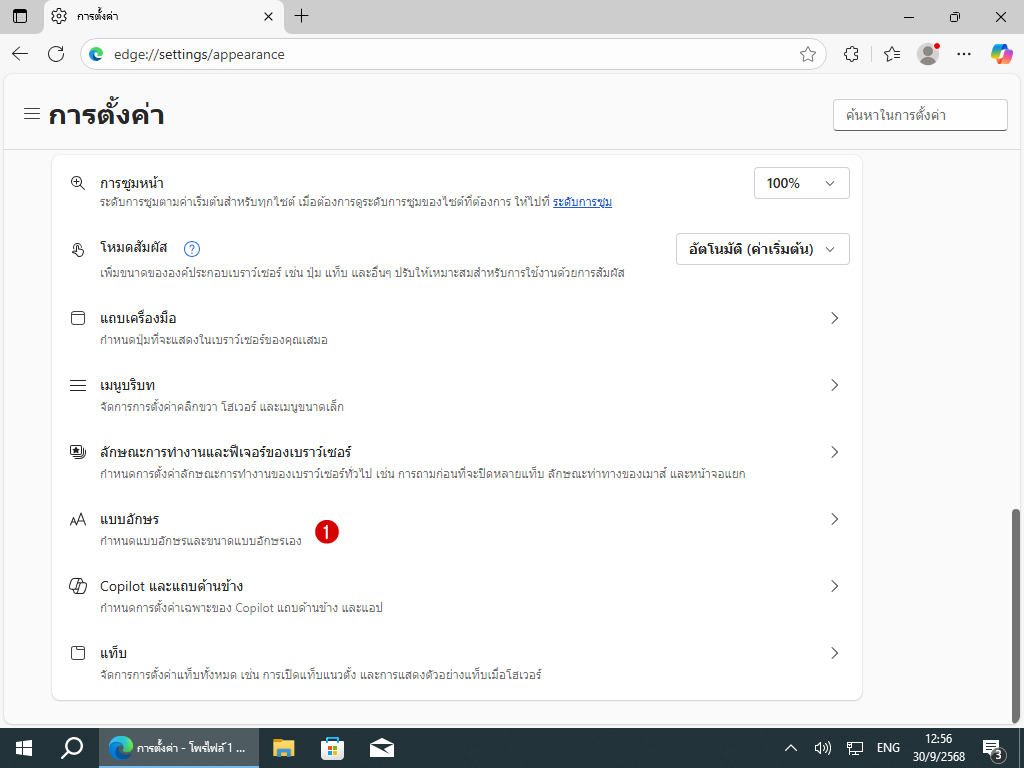 เลื่อนลงไปด้านล่างสุด แล้วคลิกเข้าไปที่หัวข้อ "แบบอักษร"