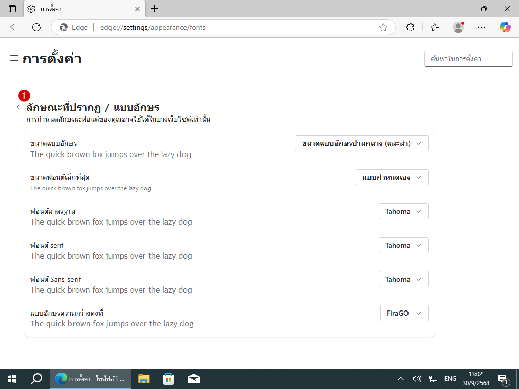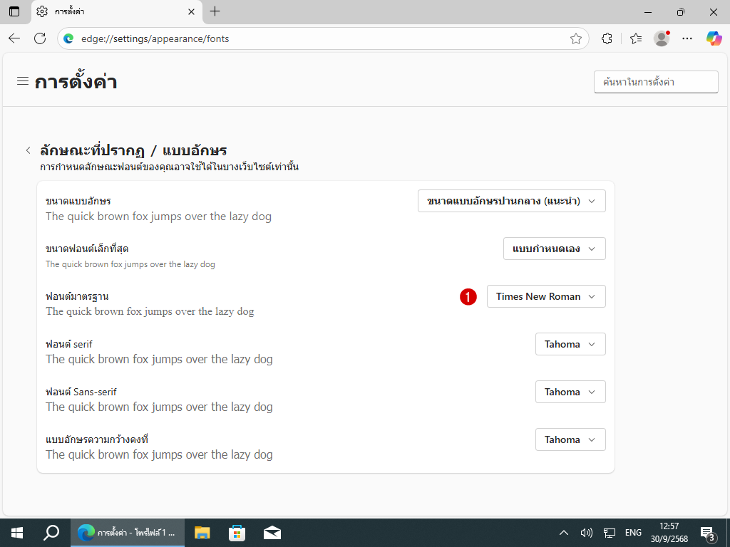 7. สังเกตุที่หัวข้อ "ฟอนต์มาตรฐาน" เป็น "Time New Roman" ให้คลิกเข้าไป