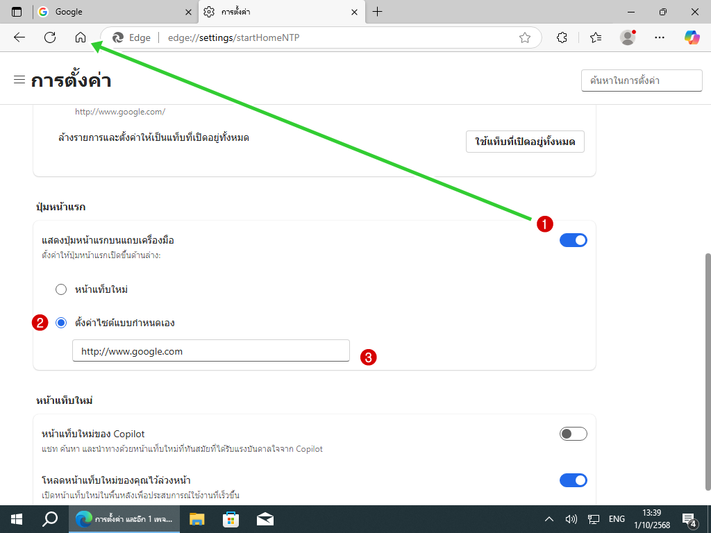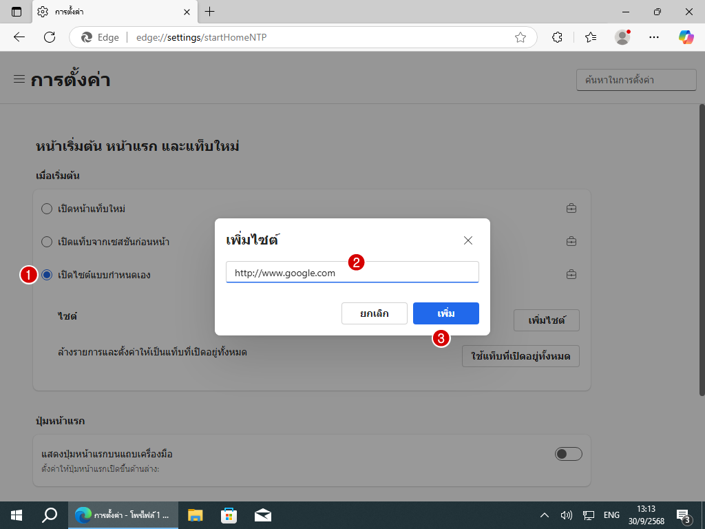 12. สมมุติว่า ถ้าเราต้องการเปิด Google ทันทีที่เรียกใช้ Edge